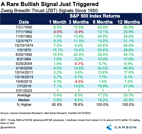 The table below shows the previous 14 ZBTs and what followed. The S&P 500 was higher a year later every time — 14 out of 14 times and up 23.3% on average.