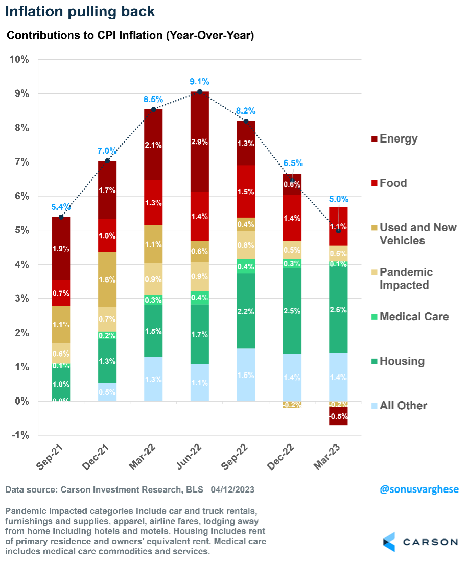 The March inflation report showed CPI inflation rose only 0.1%, slightly below expectations. Over the past year, inflation has risen 5%, well off the peak of 9% from June 2022. As the chart below shows, declining energy and food prices have pushed inflation down.