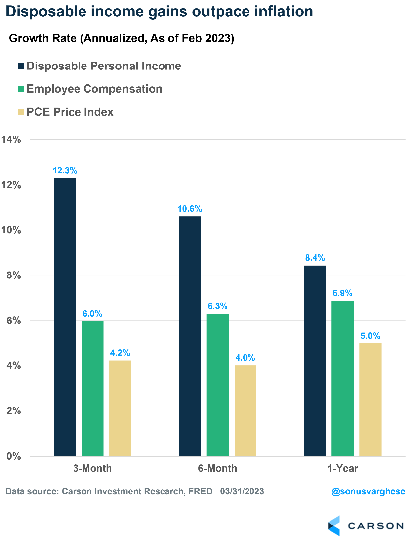 Lower inflation, by way of lower energy and food prices, means real incomes, i.e., incomes adjusted for inflation, remain strong. Stable incomes are dependent on a healthy labor market, which appears to be holding up as we wrote here.