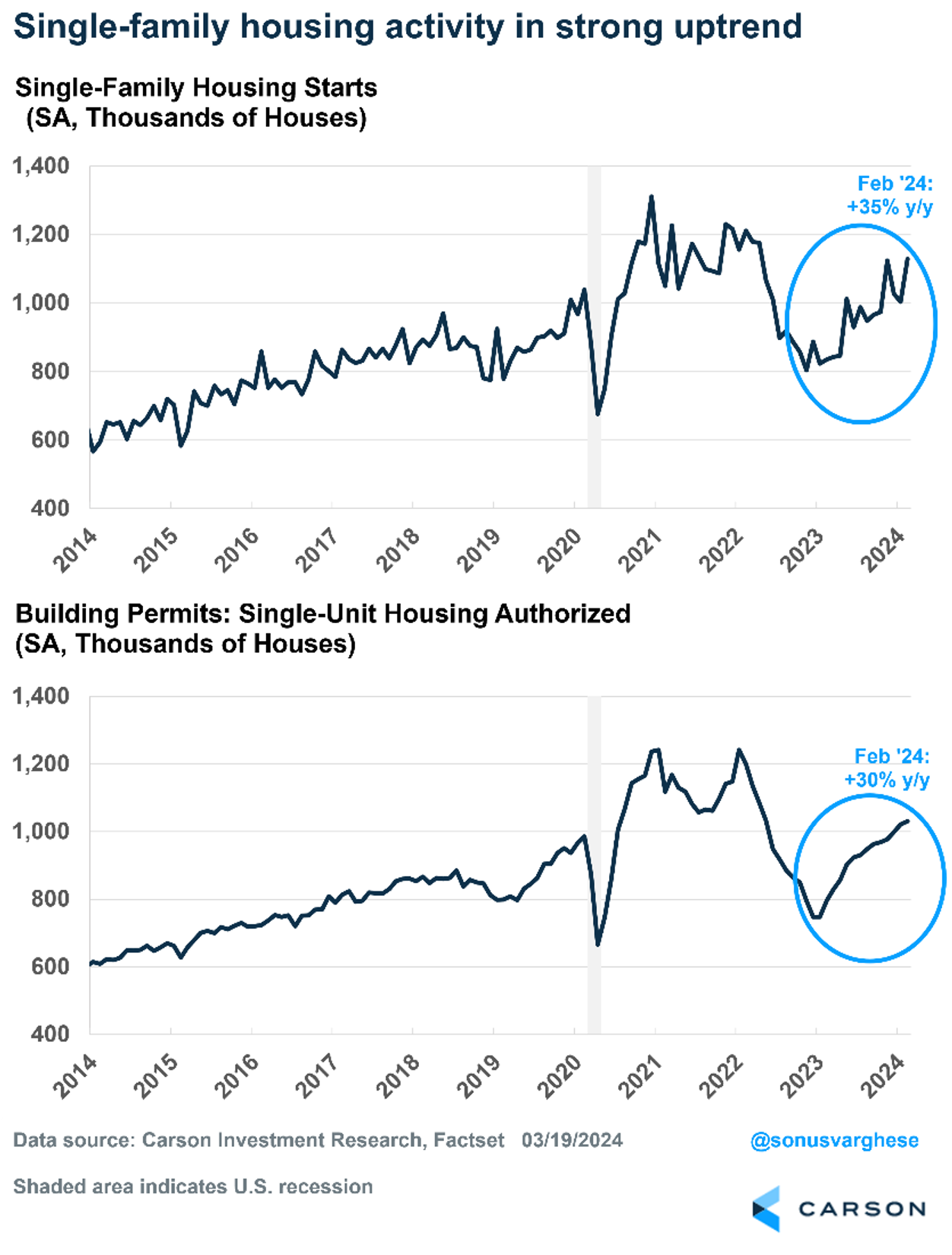 Take housing as an example. Single-family housing activity makes up the bulk of residential investment within GDP, and that crashed in 2022 as the Fed raised rates. Housing dragged on GDP growth for nine straight quarters (through the second quarter of 2023). That shouldn’t be a surprise because housing is perhaps the most interest-rate sensitive sector of the economy, and mortgage rates surged from around 4% to 8%. The good news is single-family activity has been trending higher since late last year, as rates pull back in anticipation of rate cuts by the Fed. As of February, starts are up 35% from the prior year and are now 27% above the 2019 average. Permits, which are a sign of future supply, are up 30% year-over-year and 19% higher than the 2019 average. In short, housing is likely to add to GDP growth this year.