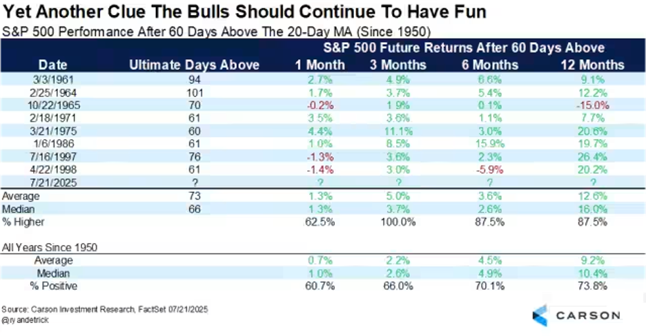 Lastly, the S&P 500 has closed above its 20-day moving average for more than 60 consecutive days, another rare and bullish development. Stocks have never been lower three months later after this has occurred and over the past 50 years we’ve seen gains of 20%–26% a year later. Add this to the growing reasons to expect this bull market to continue.