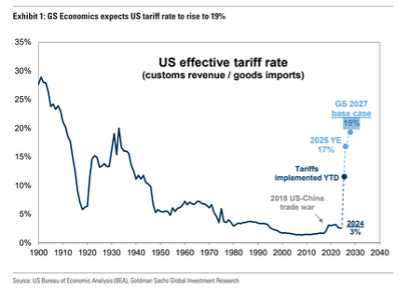 Coming back to tariffs, the average effective tariff rate is currently around 13%, about 10%-points higher than it was at the start of the year. Even though that’s high, that was pretty much the “best case” scenario for most analysts before Liberation Day. Goldman estimates that the average US effective tariff rate will rise to 19%, but that’s not expected until 2027. There’s a long way to go.