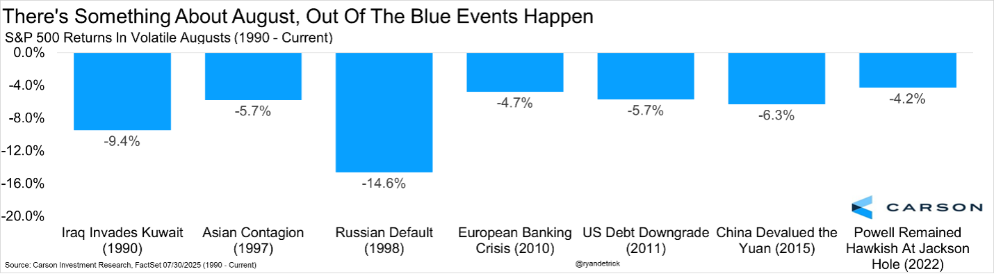 Going back to 1990 when Iraq invaded Kuwait, August is notorious for big events and market weakness. 1997 had the Asian Contagion, 1998 the Russian Default, and 2010 the European Banking Crisis. The next year saw the first US debt downgrade and a near bear market in just a few days. 2015 had the first 1,000 Dow point drop ever after the surprise Chinese yuan devaluation. Then in 2022 Jerome Powell surprised markets in August by turning quite hawkish at the annual Jackson Hole Economic Symposium. All of these times saw big drops, proving once again there is something about August.
