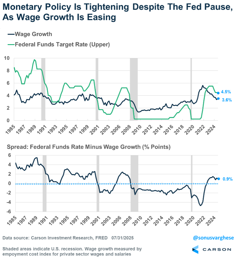 The labor market is clearly slowing, and that by itself ought to trigger interest rate cuts. Policy rates are certainly elevated at their current level of about 4.5%, especially since wage growth is near 3.5%. As we wrote in our Midyear Outlook 2025, as wage growth continues to soften, policy is getting tighter if the Fed doesn’t cut rates.