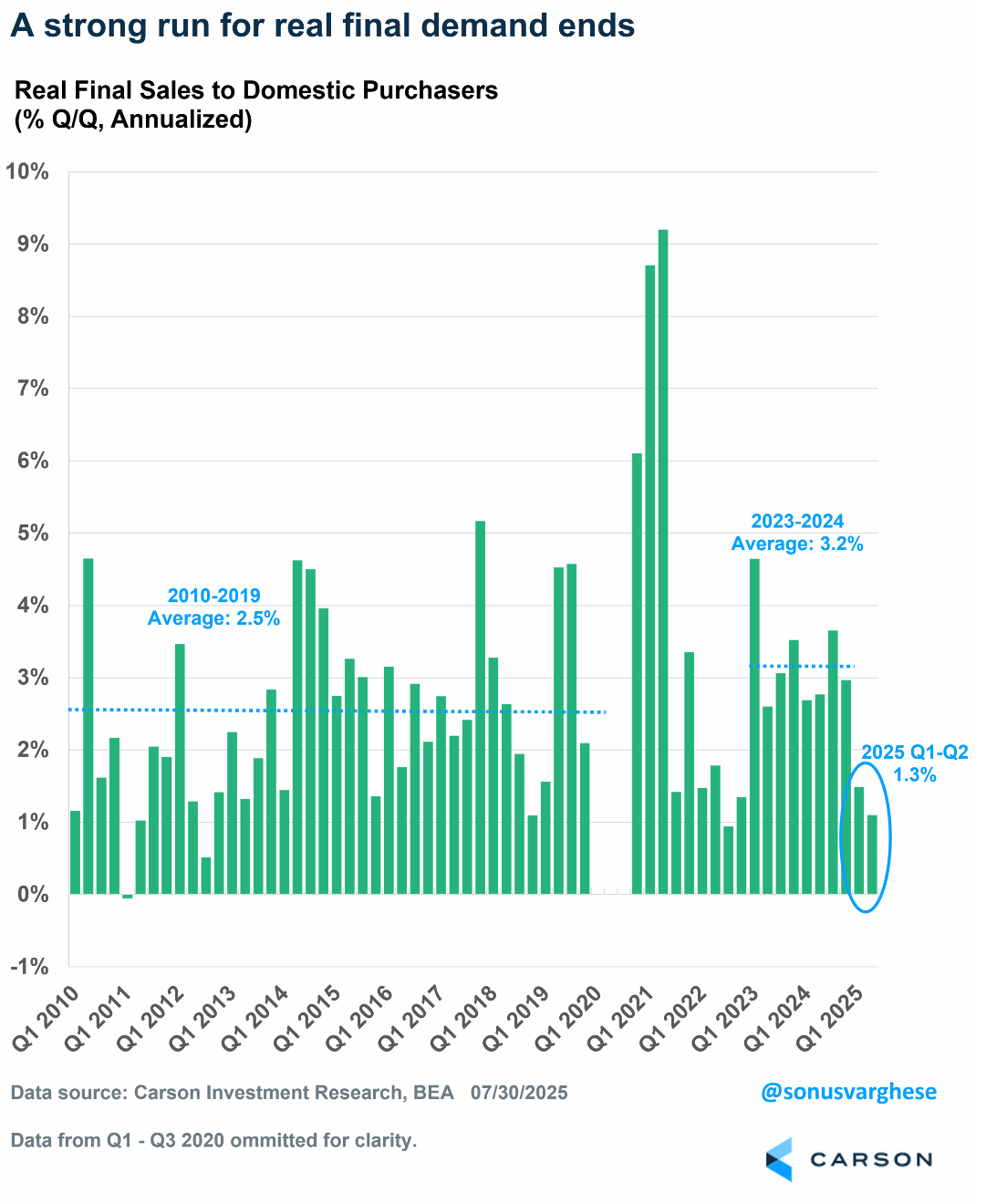 But the headline strength in Q2 GDP growth hides underlying weakness. “Real final sales,” which essentially measures consumer, business, and government spending and investment, rose 1.1% in Q2, slowing from an already below-trend pace of 1.5% in Q1—thus averaging 1.3% over the first half. For comparison, this measure rose at an annual pace of 3.2% in 2023–2024 and 2.5% in 2010–2019. There’s a real slowdown in place.