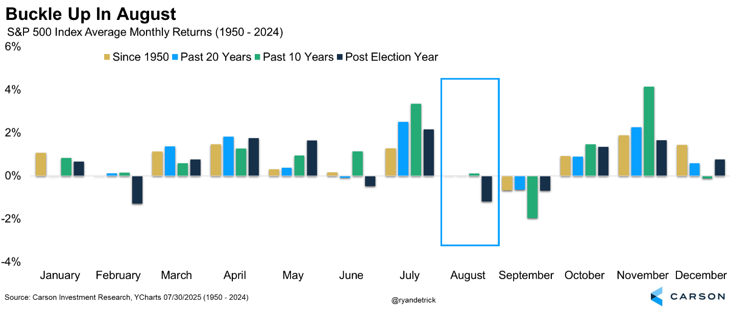 There’s a reason we called our Midyear Outlook “Uncharted Waters.” It’s not that we saw a bad outcome ahead. To the contrary, we thought (and still believe) economic growth will be enough to support continued profit growth. But the economy is facing a lot of structural changes (including AI) and that makes the way ahead harder to see. As a result, the mood can change on a dime, as it did Friday (and could again). We can’t blame the calendar, but still, there is something about August.