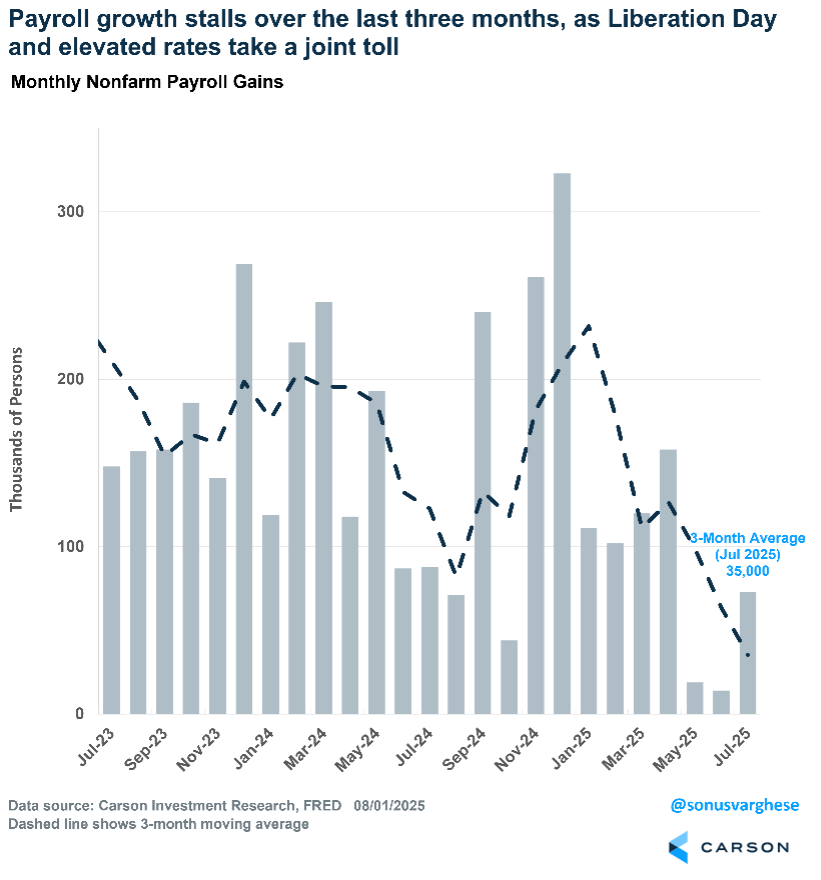 The Fed took a pass on cutting rates at their July meeting because of this. Powell pointed out that they have two mandates: stable prices and maximum employment. They believe that the labor market is in good shape right now (at least before the most recent release) and the low unemployment rate is consistent with their mandate of maximum employment. However, they’re worried about inflation remaining elevated, and pass-through effects of tariffs, which they believe will take several months to show up. The White House also has a new tariff blitz as of August 1 (but they won’t go into effect until August 7).