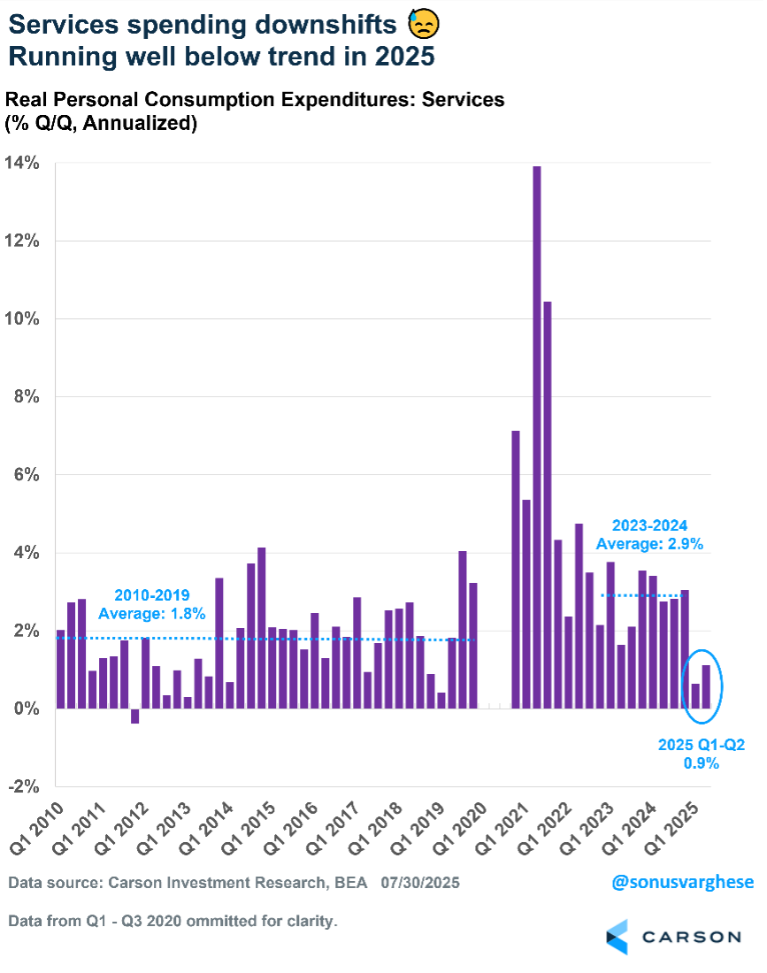 A big reason sharply easing services spending, which matters because it makes up 45% of the economy. Services spending ran at a 0.9% annual pace in the first half, a sharp downshift from the 2023–2024 pace of 2.9% and even the 2010–2019 pace of 1.8%.