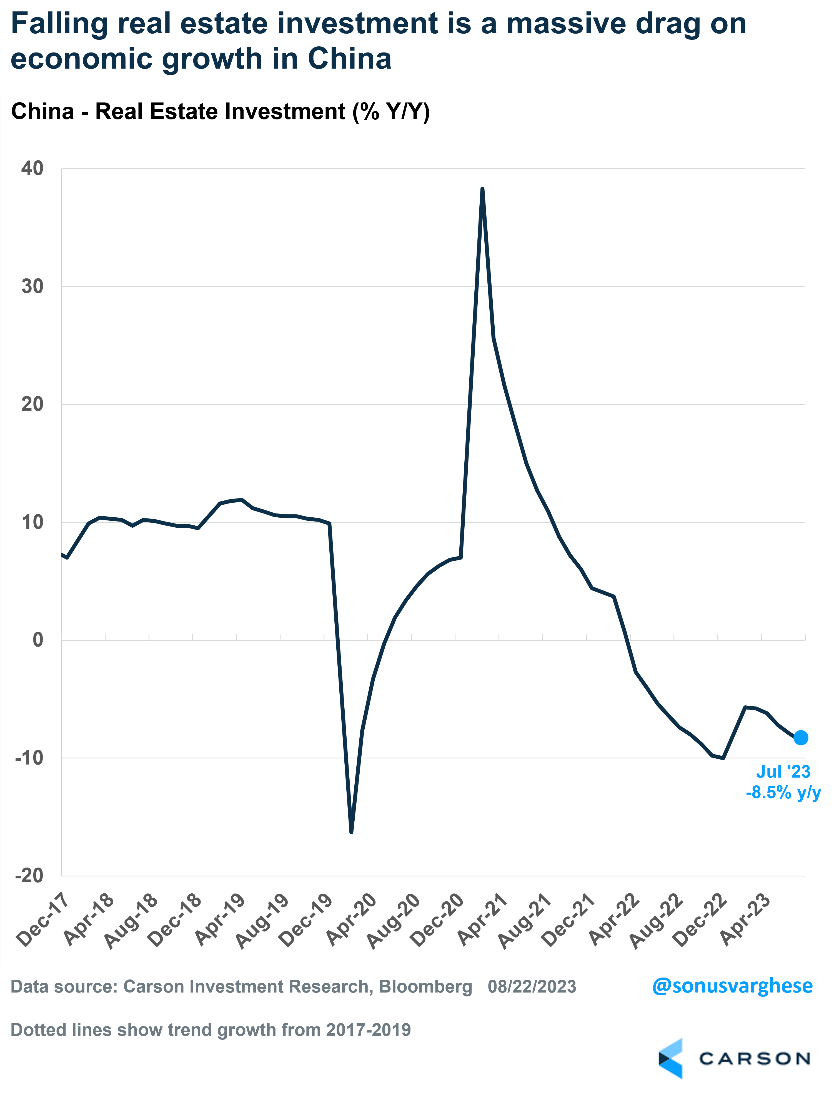 - Much of China’s economic growth is driven by real estate investment, which has pulled back significantly.