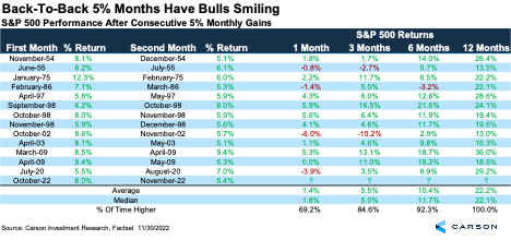 The chart below shows all times the S&P 500 has had back-to-back 5% monthly gains. The future returns are quite strong, with the average return a year later up 22.2% on average and higher 13 out of 13 times.