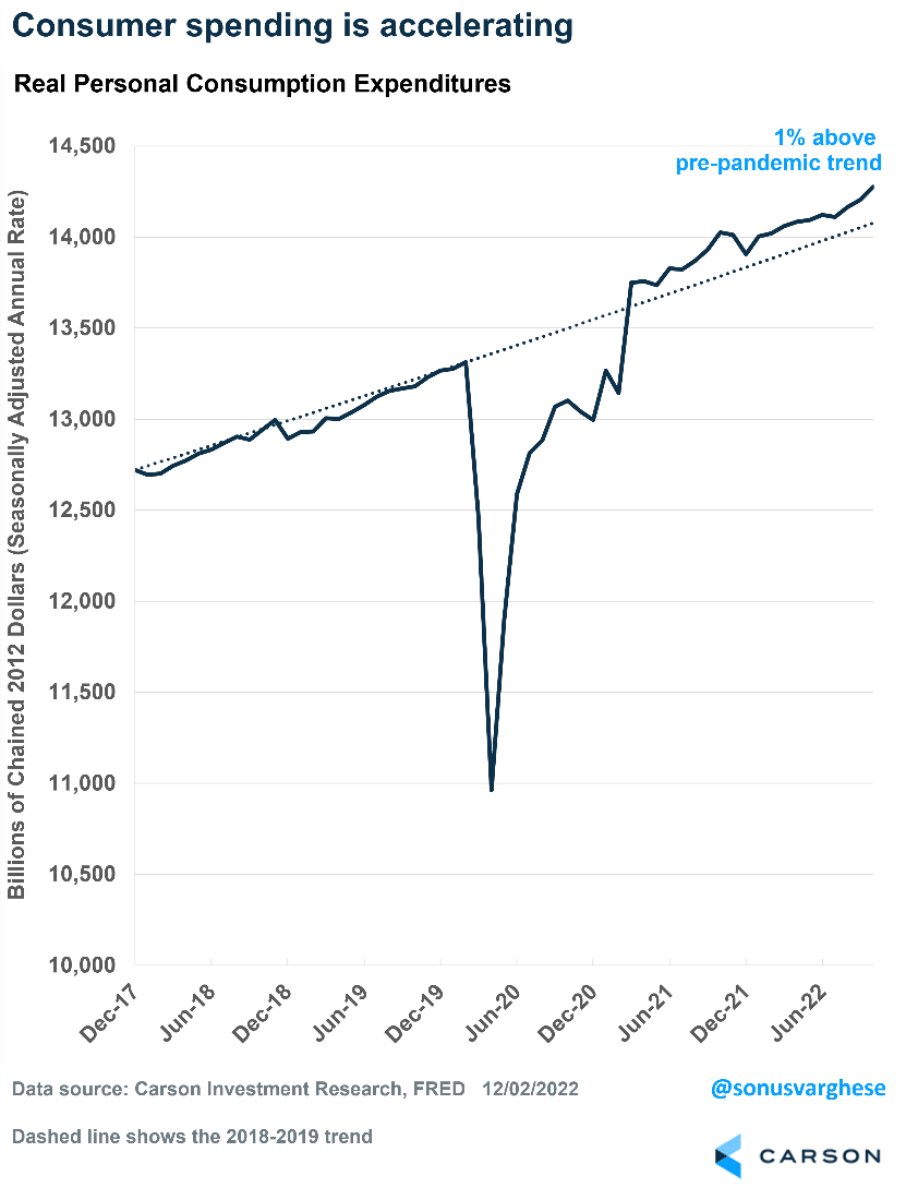 In short, inflation is easing, meaning incomes are rising on a real basis, allowing consumers to spend more — and they are. We believe this will continue into 2023 as inflation pulls back even more. Note that consumers still have excess savings from the pandemic. They’ve pulled about $1 trillion out of it over the last year, but that still leaves more than $1 trillion left over.