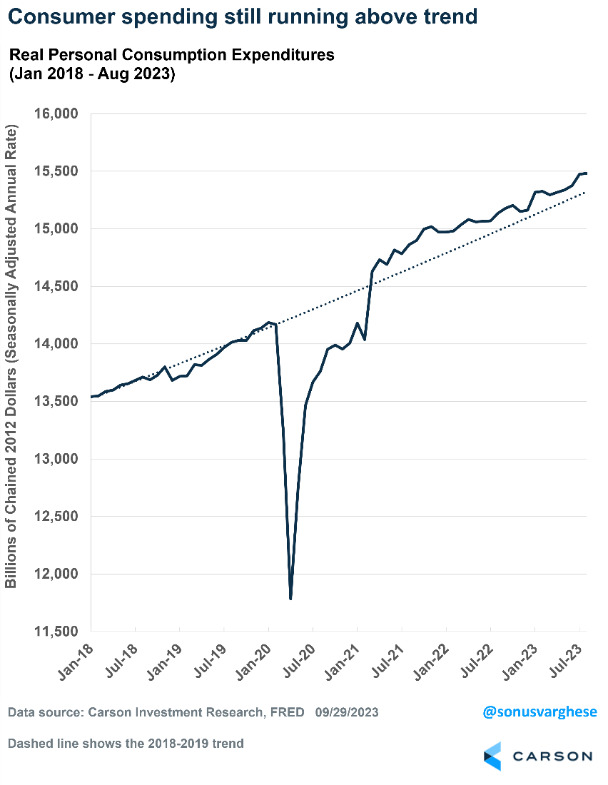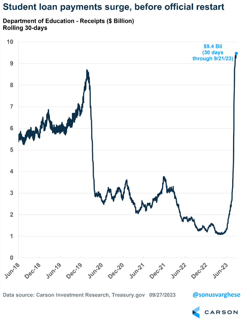 There are more details to consider, but essentially, loan payments will not surge from $0 to $6 billion in October. And based on the Department of Education receipts and July-August consumption data, even a sudden surge of payments would not be enough to dent consumption.