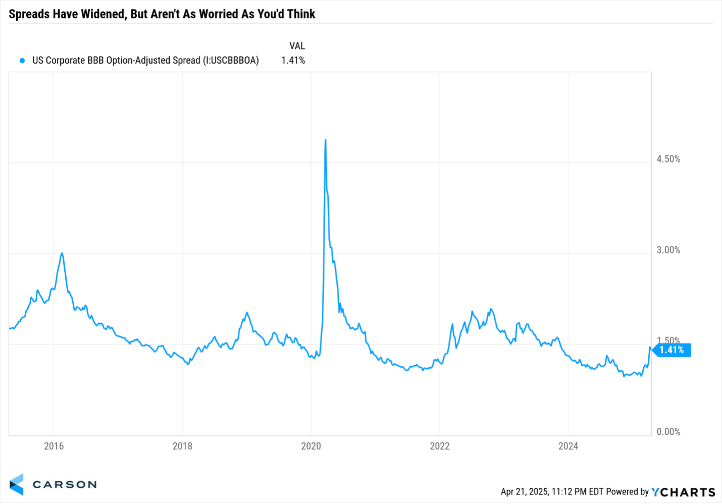 Spreads on BBB corporate bonds have widened in the past month but still aren’t as blown out as they were back in 2022 for instance.