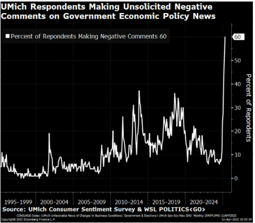 Meanwhile, consumers are making negative comments unlike anytime in history, according to the University of Michigan’s Sentiment Survey.